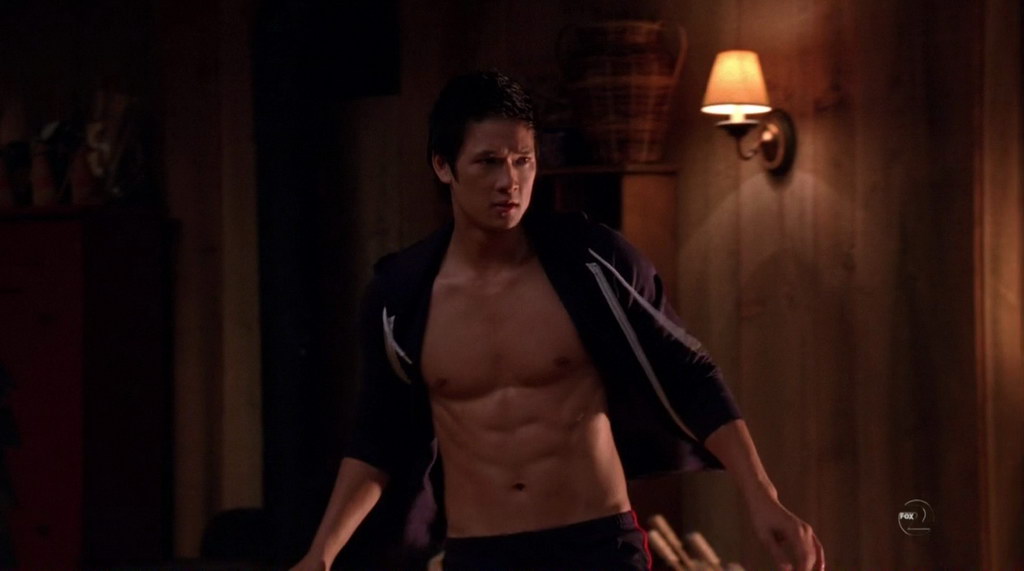 Harry Shum Jr. has a really short shirtless scene to show off his great body in the episode "Audition" of Glee.